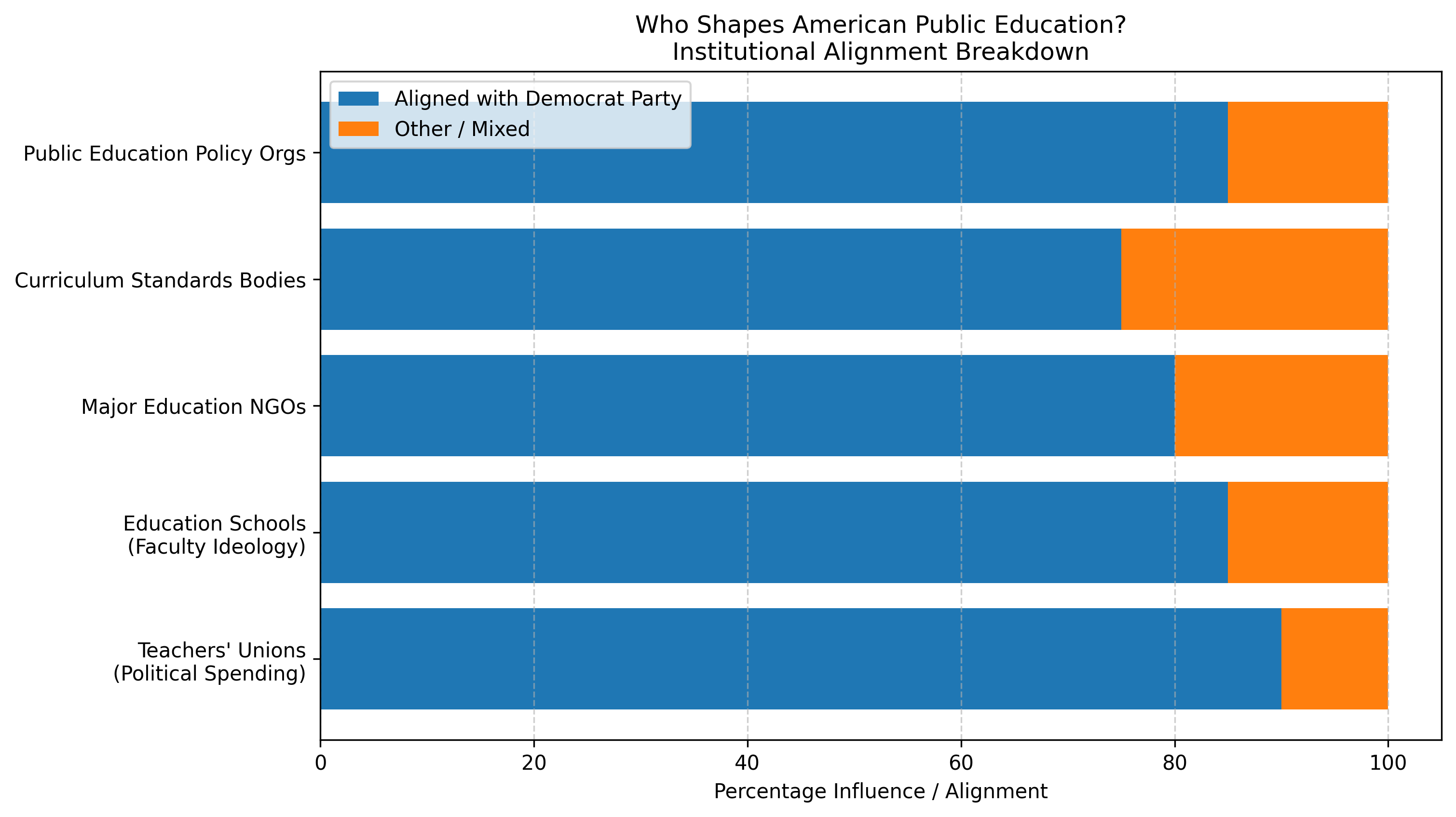 The numbers tell the story. Public education policy in the United States is overwhelmingly shaped by actors aligned with the Democrat Party. Teachers’ unions are among the most powerful political actors in American education, spending tens of millions per election cycle across PACs, advocacy arms, ballot initiatives, and coordinated campaigns. Their endorsements make clear which direction that influence runs. Education schools lean heavily left, both in faculty composition and ideological orientation. Surveys of professors consistently show ratios that would be considered unacceptable in any other profession claiming neutrality.