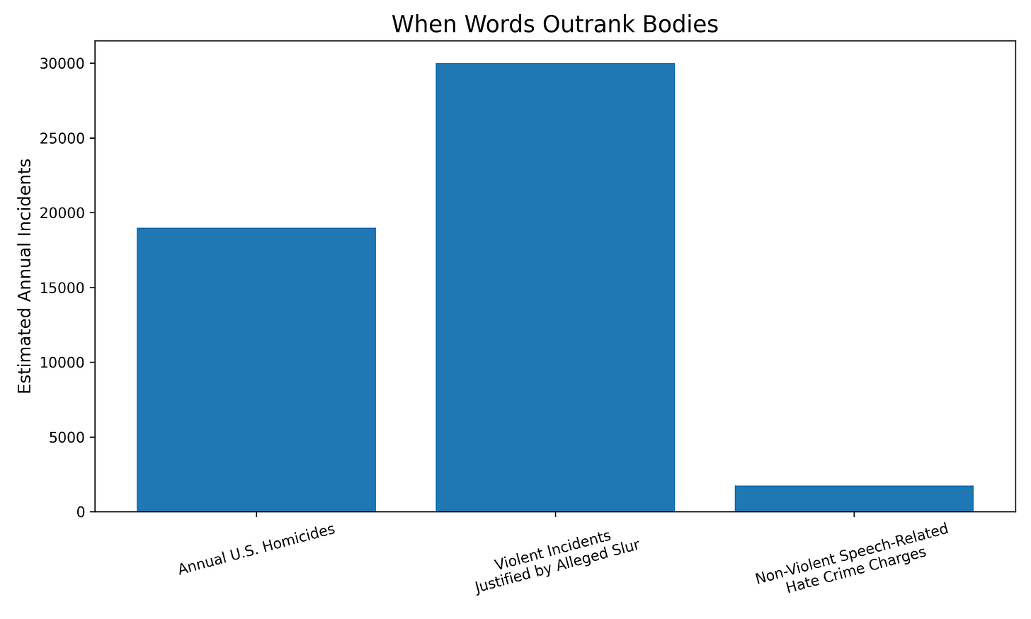 If we err on the side of caution, the figure still sits around thirty thousand times each year that violence revolves around this single word. To give perspective, the United States sees fewer than twenty thousand homicides a year. So we are dealing with a volume of incidents where human beings abandon judgment over a word that rivals, and perhaps surpasses, the number of people killed in murders each year.