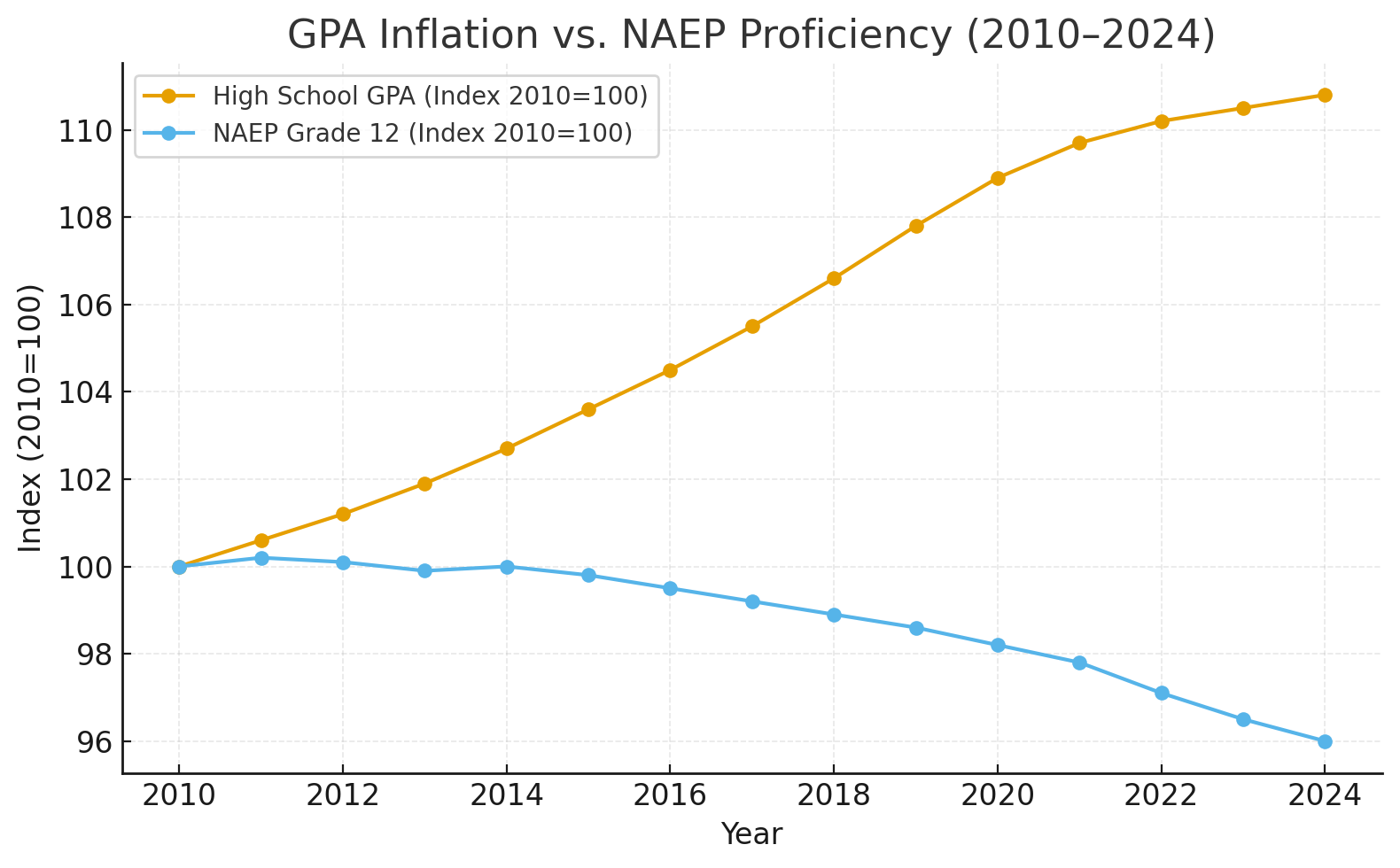 Grades broke from reality. GPAs climbed while national assessments flattened or fell. Colleges dropped tests, remedial enrollment stayed high, and employers complained about basic writing and numeracy that a diploma was supposed to certify. Higher education grew administrative layers and politics while tuition kept rising. Debt forgiveness shifted costs to the public without forcing universities to cut prices or trim bureaucracy.