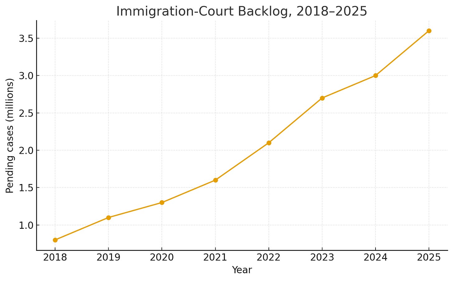 Practice in the early 2020s compounded the problem. Encounters at the Southwest border hit records, the immigration-court backlog grew into the millions, and formal asylum applications waiting for hearings reached into the two‑million range. Big intake cities budgeted billions for shelter and related services, crowding out other priorities. The approach was sold as safe and orderly. It was neither safe for public order nor orderly for the courts.