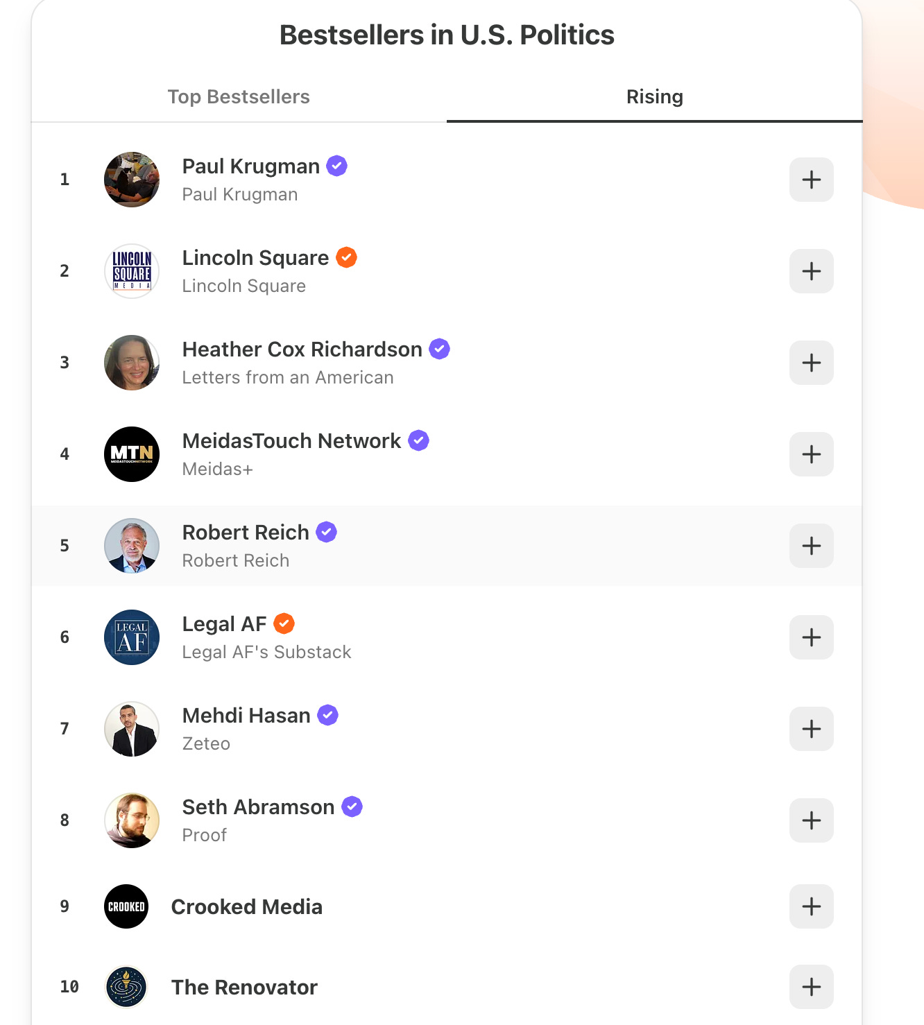 Here’s who currently dominates the Top 100 Rising in U.S. Politics on Substack. Many of them carry a blue checkmark, which means tens of thousands of verified paid subscribers.