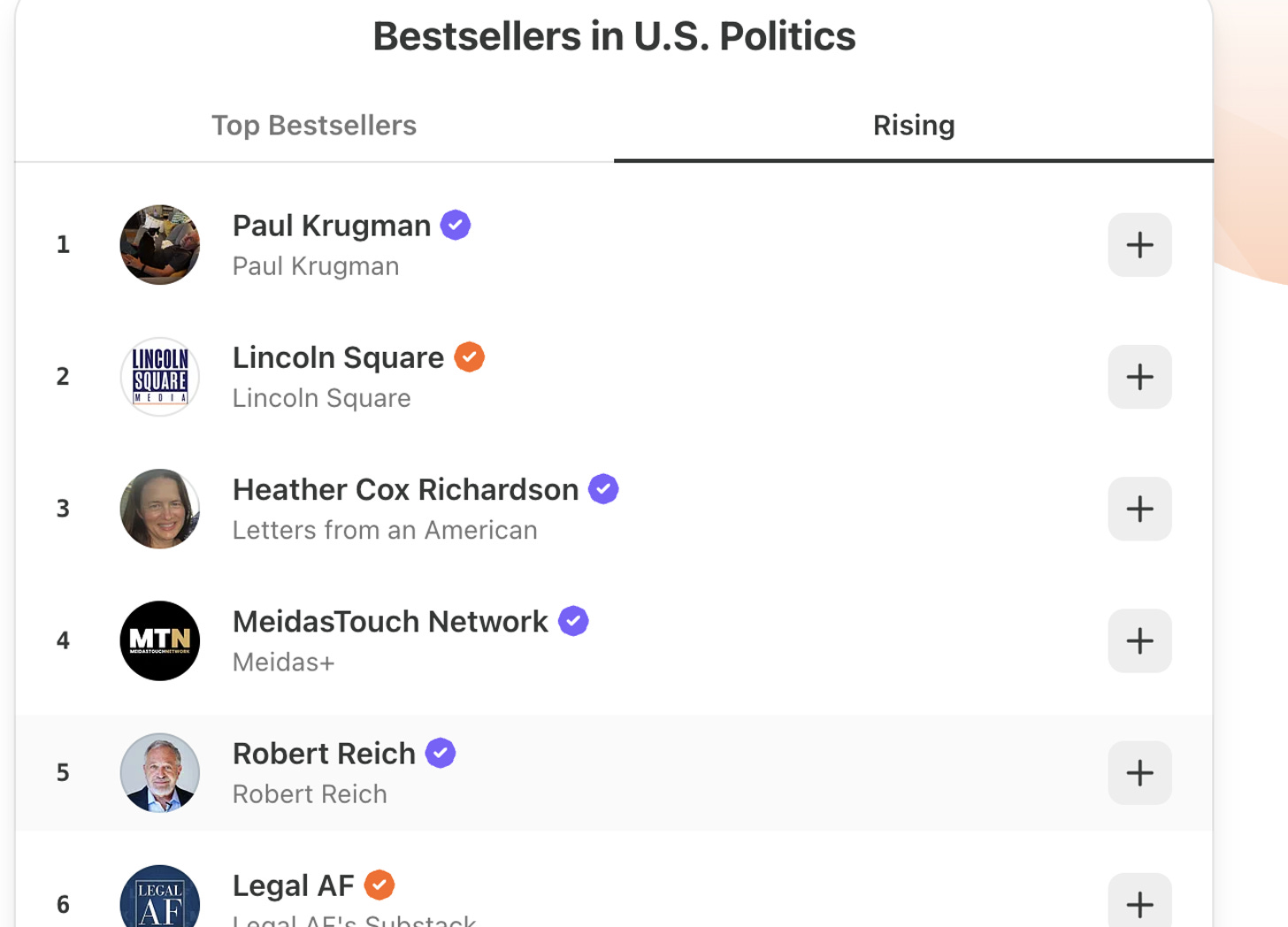 Two weeks ago, I broke into the Top 100 on Substack’s Rising Bestsellers in U.S. Politics list.