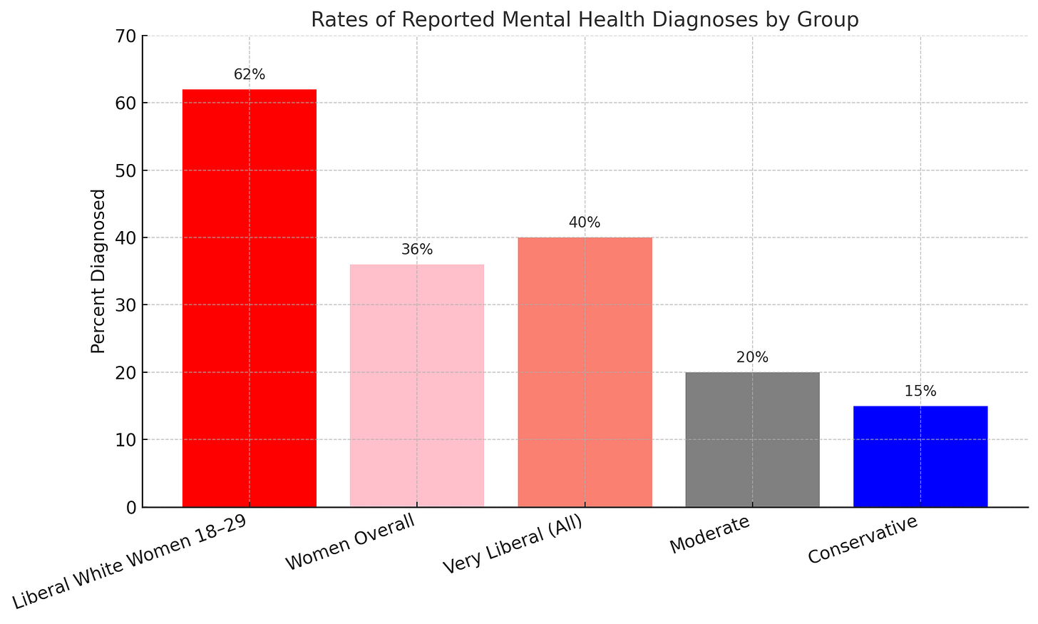 The numbers back this up. A Pew Research study from 2020 found that 62 percent of liberal white women aged 18 to 29 reported being diagnosed with a mental health condition. Among very liberal respondents overall, rates of anxiety and depression are far higher than among moderates or conservatives. According to Gallup, Democrats are more likely than Republicans to report a depression diagnosis. CDC data show that among teenagers identifying as LGBTQ, nearly 70 percent report persistent sadness or hopelessness, and 45 percent have seriously considered suicide. These aren’t just private struggles. They’ve become political assets.