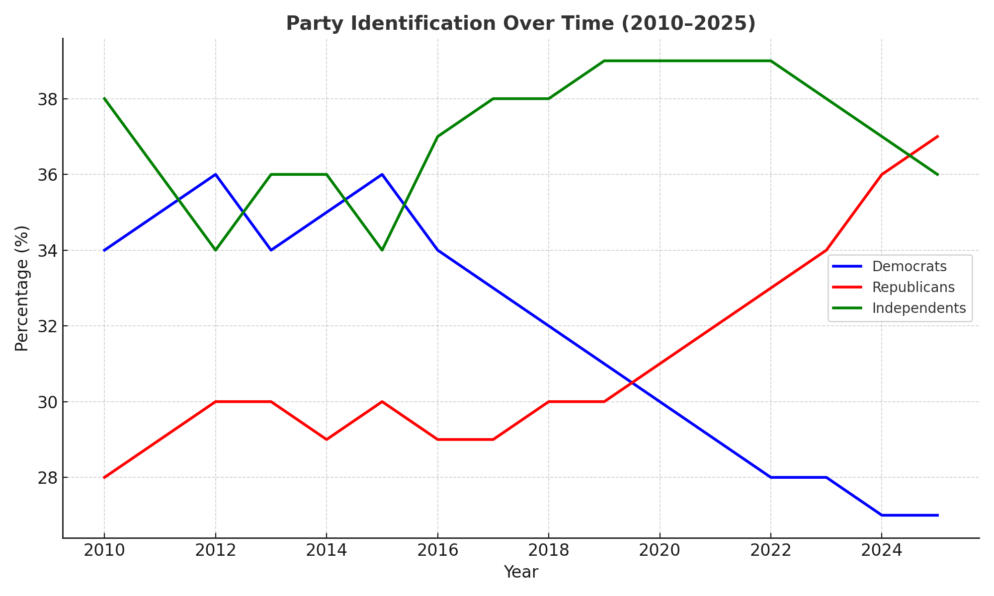 The numbers tell the story. Trump won the presidency again. Republicans flipped the Senate to 53 seats. The GOP held the House. Gallup surveys taken in early 2025 show Democrats at just 27 percent party identification, a near-record low. Independents now outnumber both parties and lean right on crime, the border, and gender politics. In other words, the voters who decide elections are moving away from the Left. Yet the Democrats’ response has been more of the same.