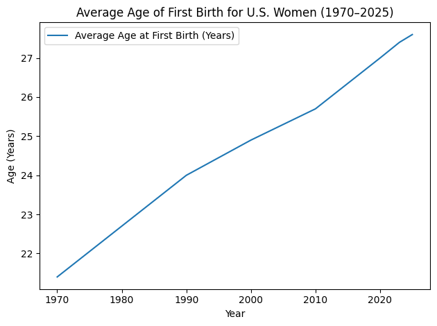 In 1970, the average age of first birth for American women was approximately 21 years old. By the early 2020s, that number had risen to about 27 years old according to data from the Centers for Disease Control and Prevention.