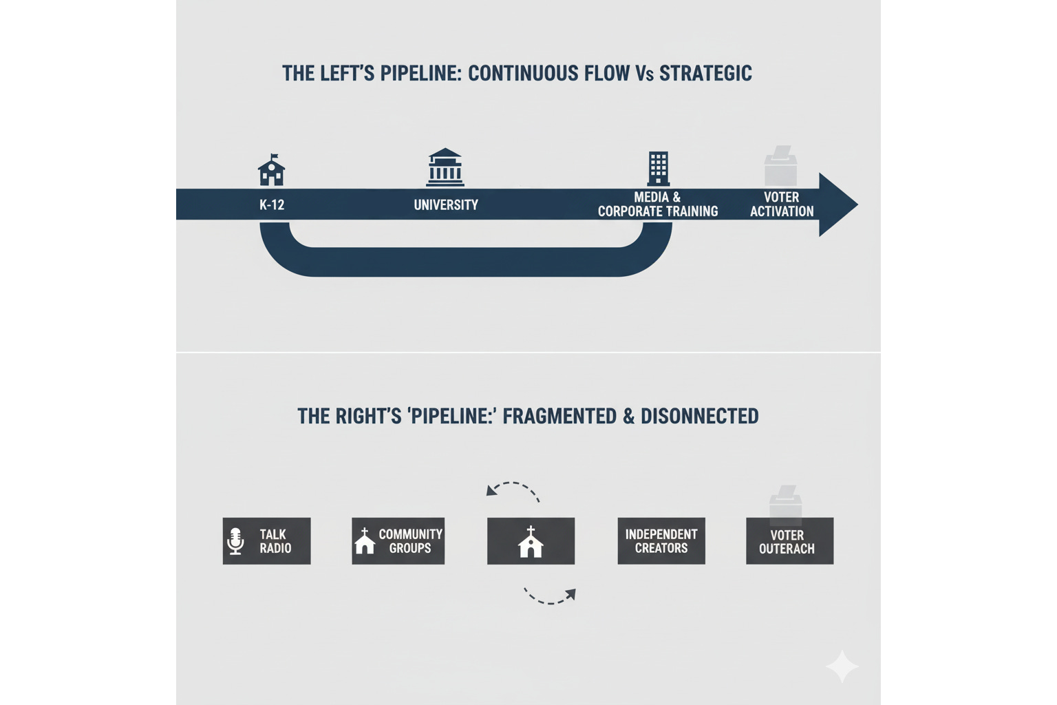 We cannot change the future if we do not educate those who will live in it. The Left understands this. That is why their influence begins in kindergarten and extends through the universities, media, and corporate training programs. They have built a continuous educational pipeline that shapes the worldview of young Americans long before those Americans encounter a ballot box.