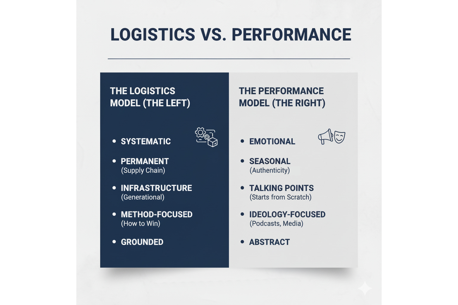 Republicans, on the other hand, think seasonally. Every cycle starts from scratch. We talk about energy and authenticity, as if sincerity were a substitute for systems. We complain about censorship while refusing to build our own distribution networks. We call ourselves the party of business and efficiency, yet we continue to run our politics like an amateur startup that never scales.