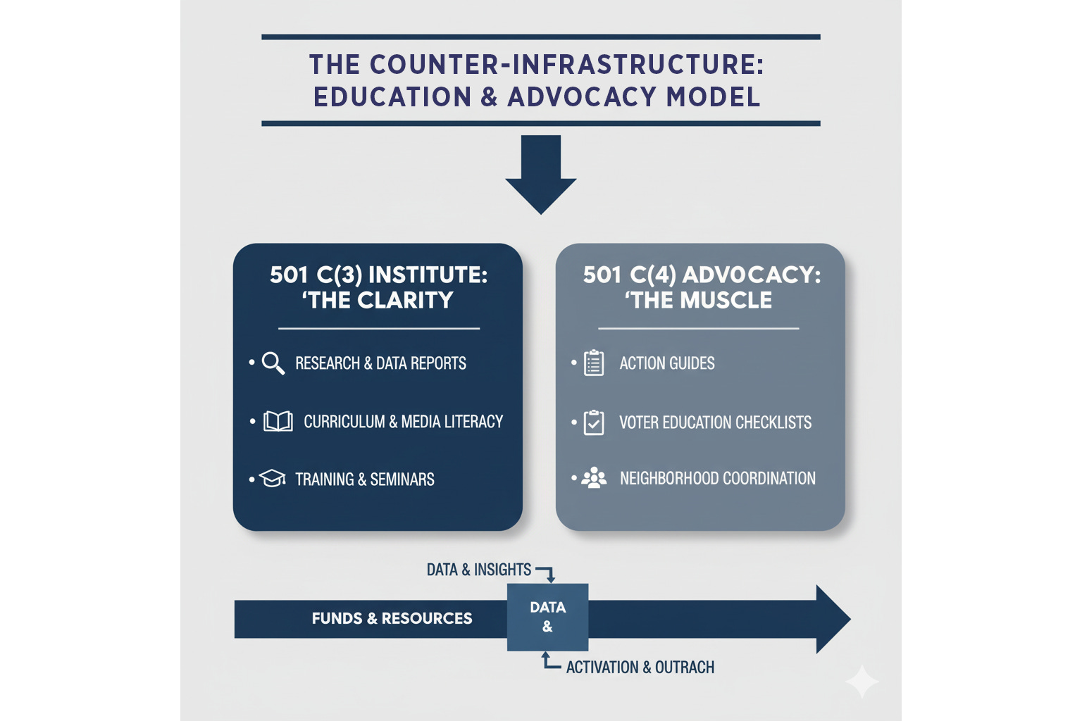 The second part is a 501(c)(4) that handles advocacy and rapid response. It will turn the institute’s research into action guides for communities. It will coordinate lawful voter education, ballot plan checklists, neighborhood captains, and local events that connect people who are serious about achieving outcomes. It will support legal and policy engagement when rules change or when maps and procedures are revised to maintain one-party control. The point is simple. Education supplies the clarity. Advocacy supplies the muscle.