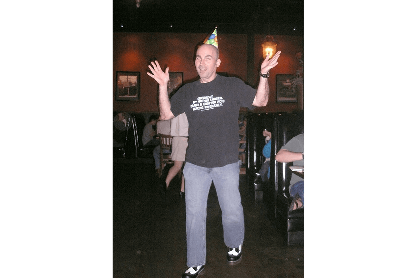 My 38th birthday picture still makes me laugh. I am standing there in black-and-white shoes and a party hat, wearing a shirt that said, “Obviously, my mom drank, smoked, & dropped acid during pregnancy.”