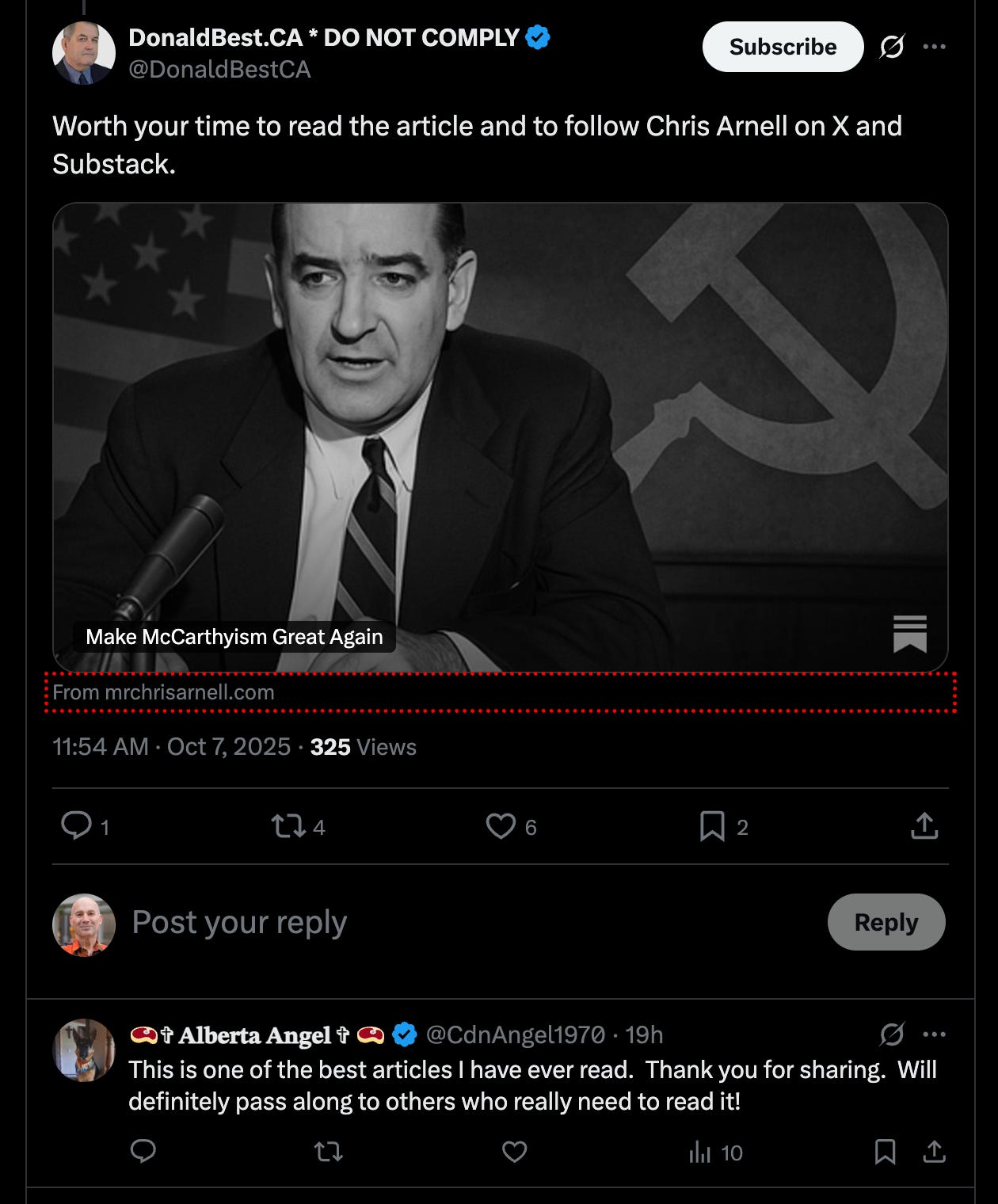A man named Donald Best, someone I don’t know, never interacted with, and didn’t even follow, shared my article Make McCarthyism Great Again with the words: