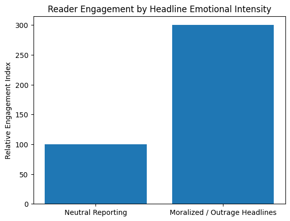 Universities create the ideology. Media amplifies it. By 2020, the business model of outrage was already visible; by 2026, it is the economy of journalism. A rational headline might hold attention for thirty seconds. An emotional one, especially a headline framing opponents as wicked, cruel, or fascist, can drive clicks for days.
