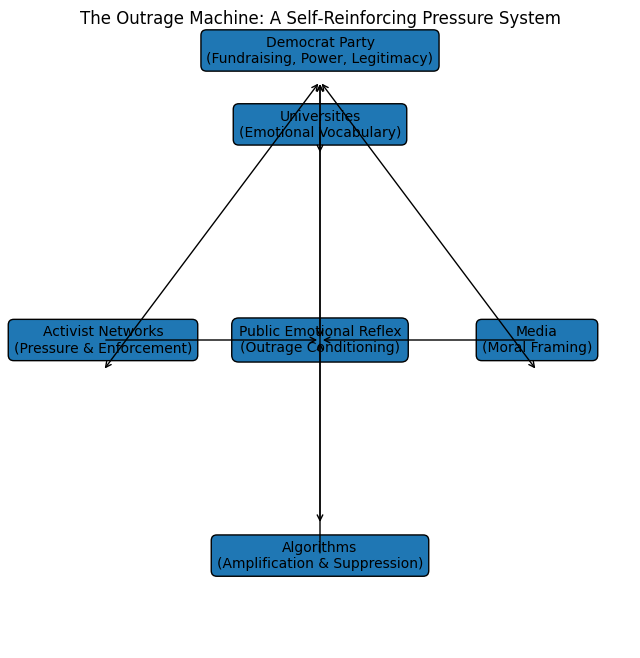 If we visualize the system, universities provide the ideological firmware, media supplies the daily fuel, algorithms distribute and reinforce, and activists apply kinetic pressure. The Democrat Party harnesses these layers to maintain an environment where outrage is both identity and weapon.
