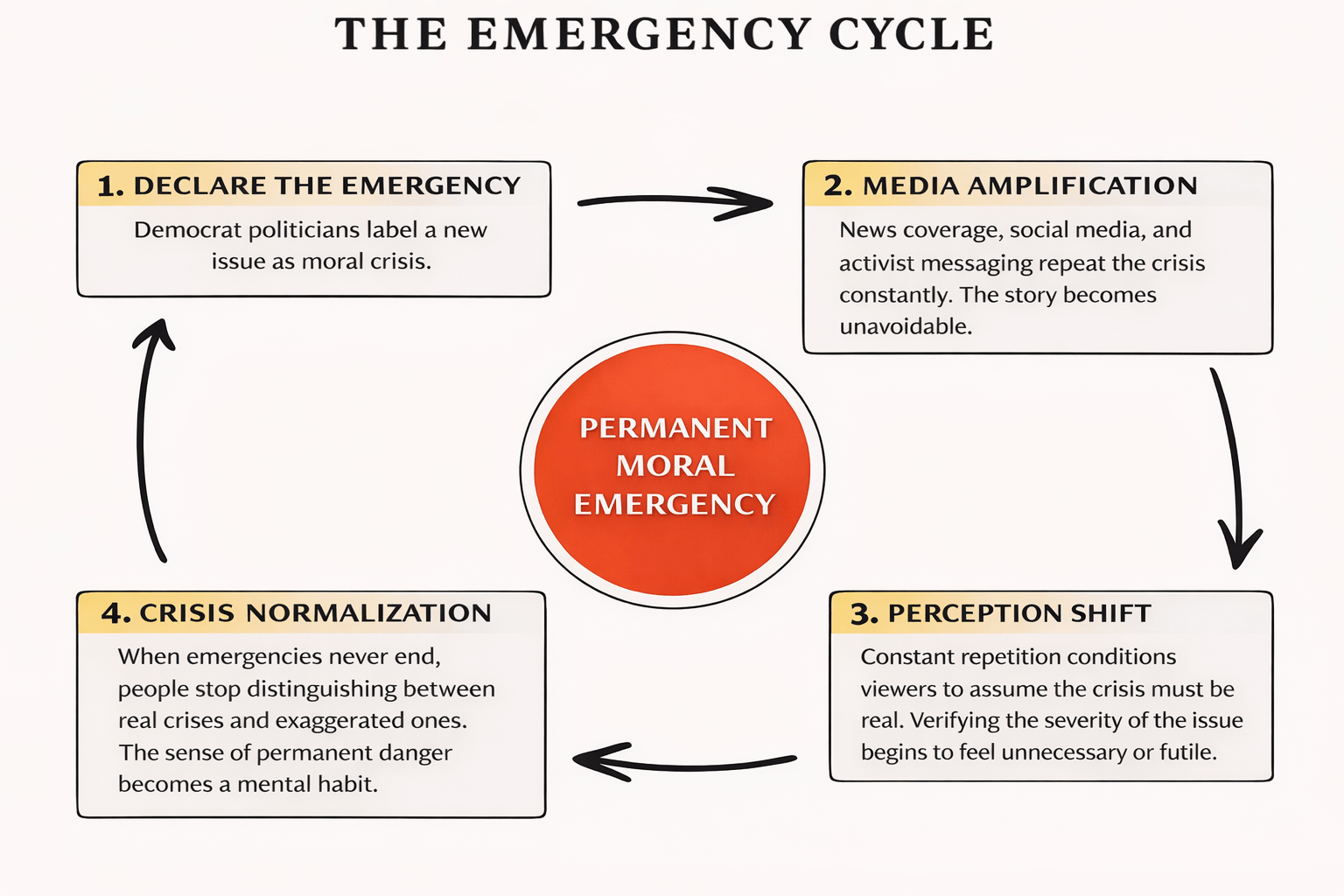 Finally, normalization sets in. When emergencies never end, the sense of crisis becomes habitual. Citizens gradually lose the ability to distinguish between severe problems and exaggerated ones.