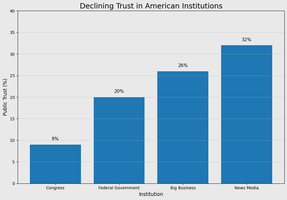 The consequences are measurable. A 2023 Pew Research survey found that roughly seven in ten Americans believe political divisions are greater than at any time in their lives. Gallup polling shows public trust in major institutions such as Congress, the media, and the federal government falling below thirty percent.