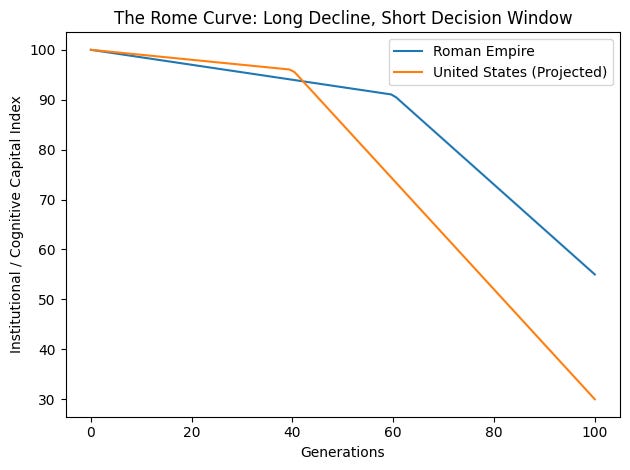 When we discuss the “Rome Curve,” we refer to the measurable lag between the moment a population loses its collective ability to solve complex problems and the moment its physical infrastructure finally fails. It takes a certain level of cognitive capital to maintain a power grid, a sophisticated legal system, or a modern medical apparatus.