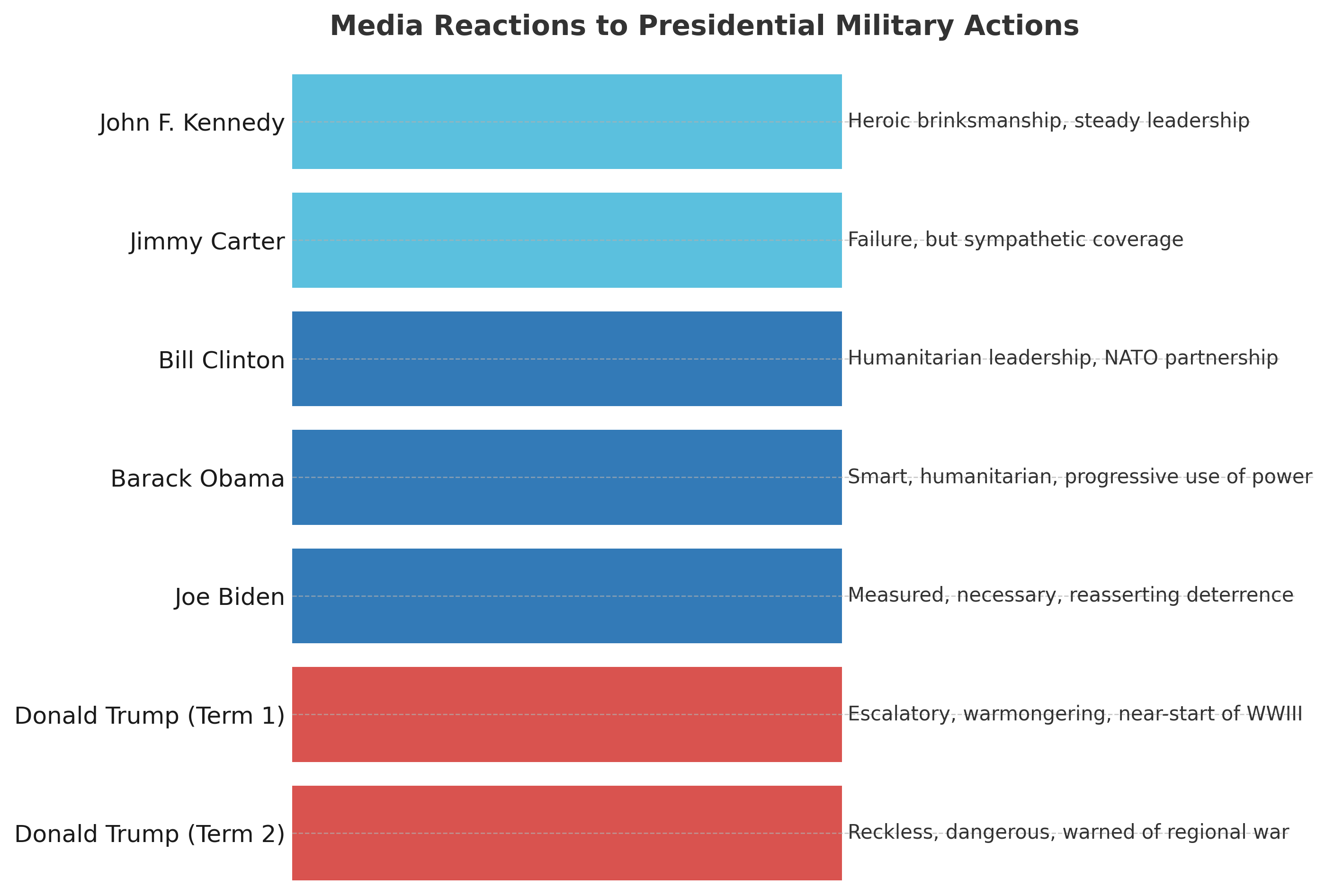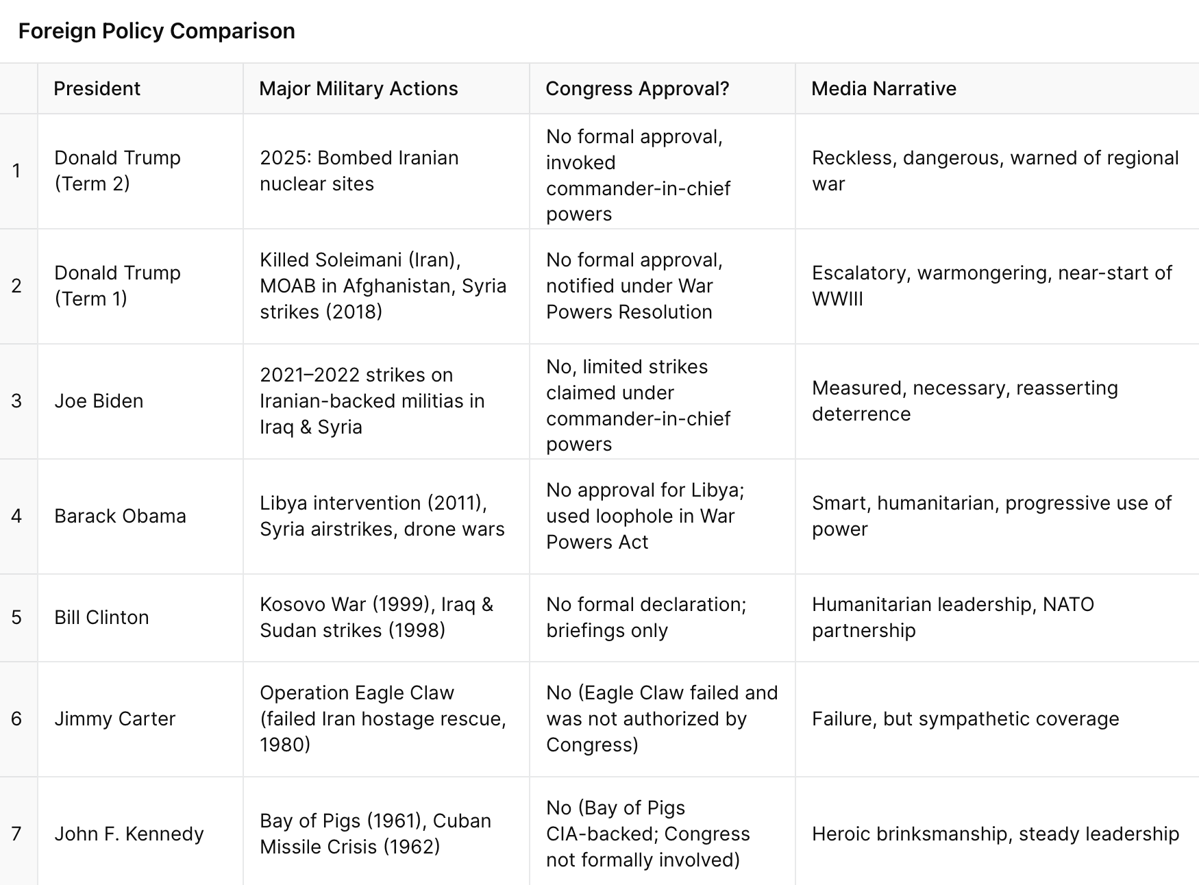 Even more egregious, according to critics, was the muted media response when Joe Biden authorized strikes on Iranian-backed militias in Syria and Iraq in 2021 — without Congressional approval. These were not nuclear facilities, nor were they widely debated. Yet, the Washington Post described the strikes as “a calibrated effort to reassert deterrence.” The New York Times framed them as “a tough but necessary choice.”