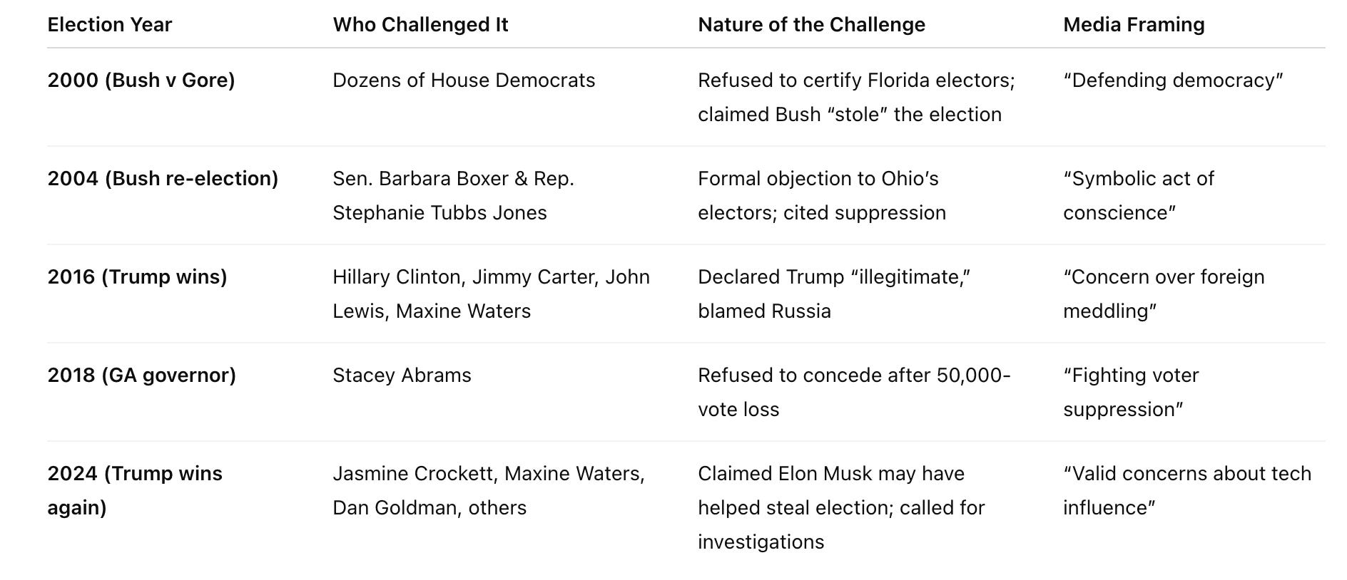 In 2004, after Bush’s re-election, Sen. Barbara Boxer and Rep. Stephanie Tubbs Jones formally objected to Ohio’s electoral votes, citing unproven allegations of voter suppression. CNN described the move as “symbolic” and quoted Boxer saying, “We must fix our electoral system.” At no point were these Democrats labeled as threats to democracy.