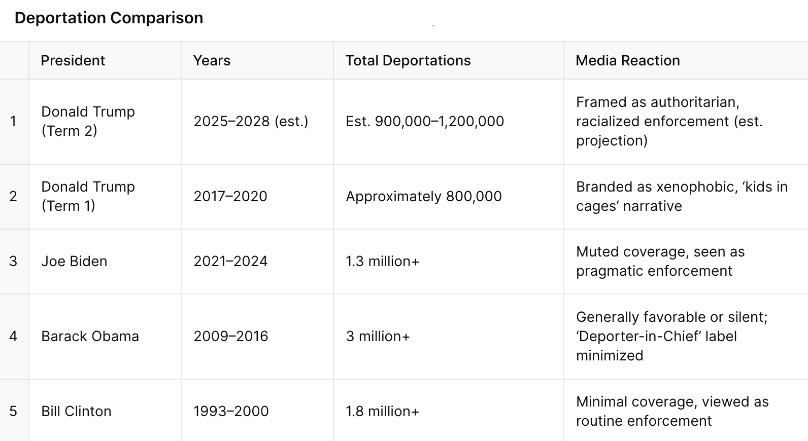 The facts are plain: deportation policy under Democrats is framed as humane; under Republicans, it’s cast as inhumane — regardless of actual numbers or procedures. Only the narrative shifted.