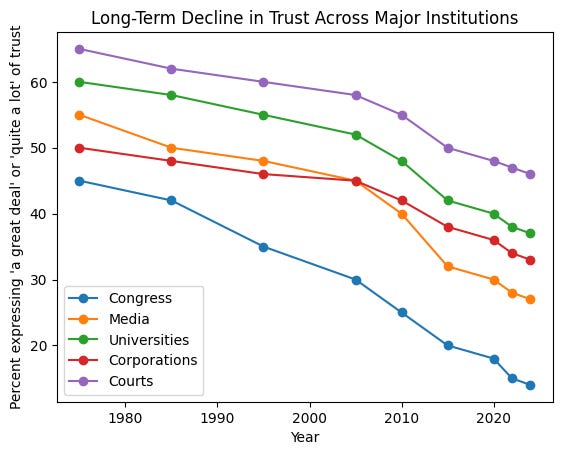 By the early 2020s, trust in nearly every major American institution had collapsed to historic lows. Surveys showed declining confidence in Congress, the media, universities, corporations, and public health authorities. Even institutions that retained higher trust, such as the courts, became increasingly viewed through partisan lenses. The result was not skepticism targeted at specific failures, but a generalized disbelief in neutrality itself.