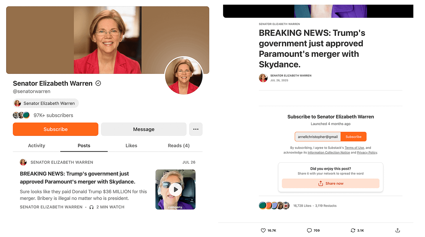 The moment a senator or congresswoman imports a campaign list, the playing field collapses. Suddenly Substack is not a competition of ideas. It is a competition of databases.
