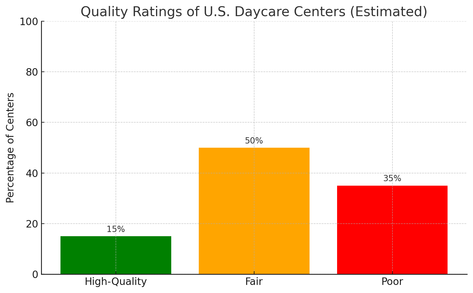 This is not just anecdotal. Reports from the National Institute of Child Health and Human Development have long noted that only about 10–15% of U.S. daycare centers provide what they classify as “high-quality care.” The vast majority fall into “fair” or “poor” categories.