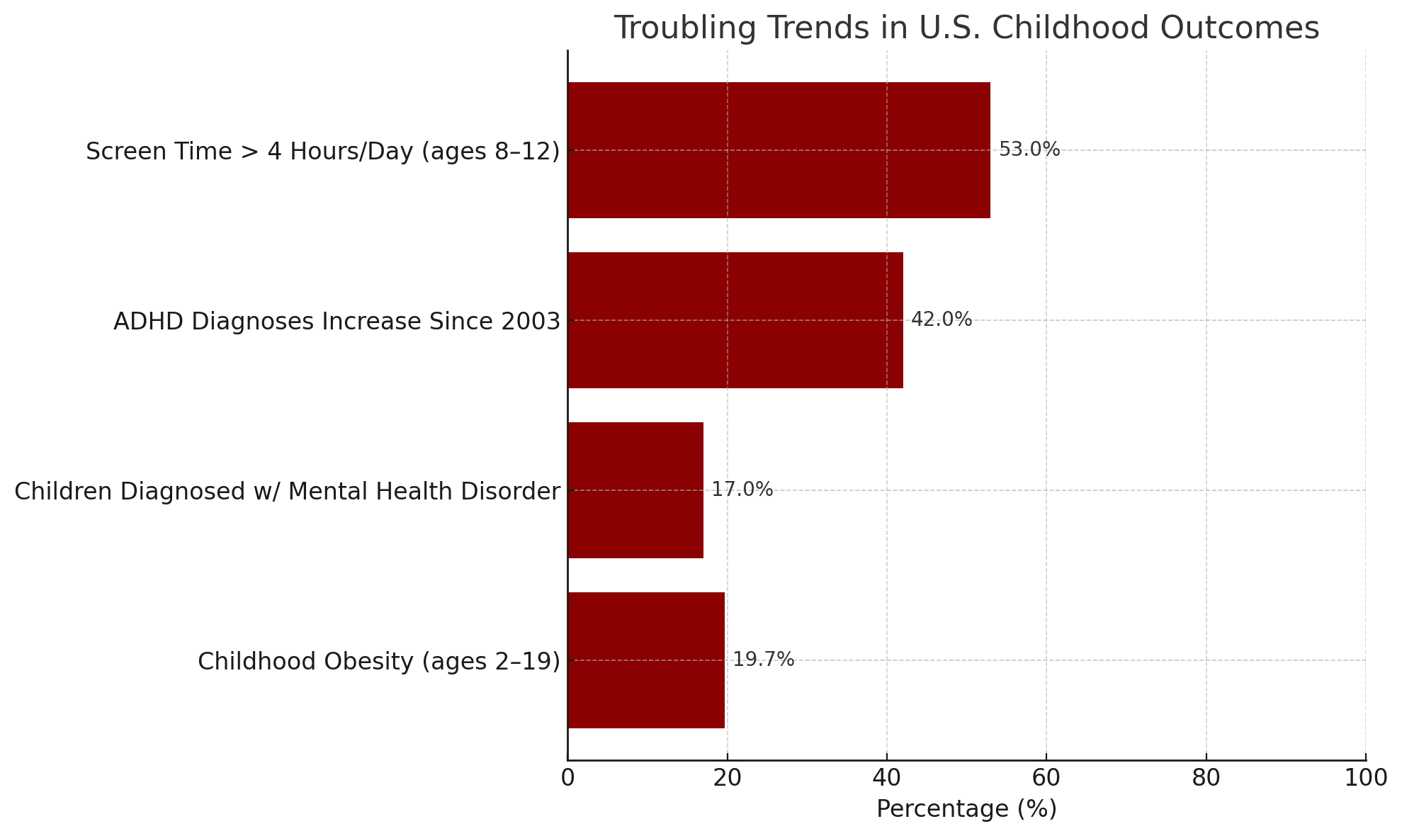 America’s children are sicker, sadder, fatter, and more broken than ever. One in five children is obese. One in six has a diagnosed mental health disorder. Screen time has replaced parental time. Fast food has replaced family dinners. Dependency has replaced discipline. And behind every trend is the same root: parental absence.
