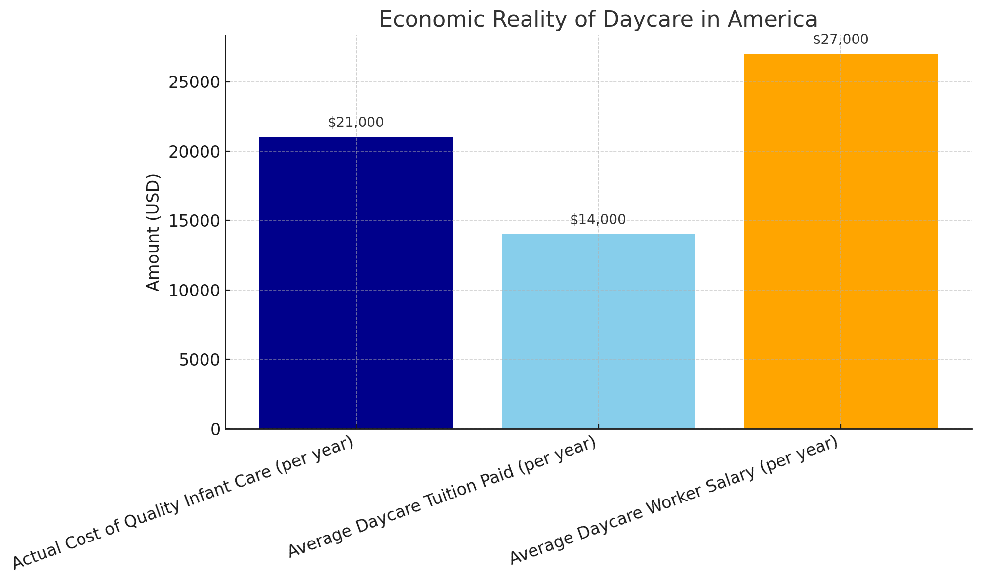 Estimates from the Center for American Progress show that the actual cost of quality infant care is upwards of $21,000 per year, per child. Yet most centers charge far less—because they have to. The average American family with young children cannot absorb that burden. So corners are cut. Teachers are underpaid. Curriculum is improvised. Meals are downgraded. Maintenance is deferred. And the entire system floats just above insolvency.