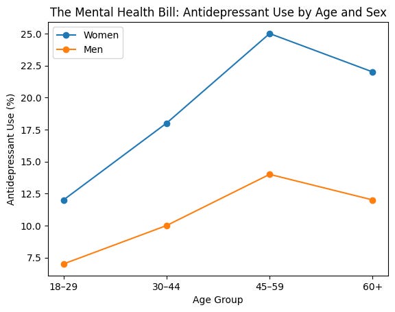 One of the clearest differences shows up in women in midlife. Women are more likely than men to be prescribed antidepressants, and usage is high in the 40 to 60 range.