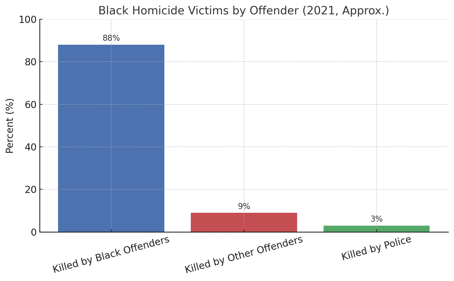 In 2021, there were 13,234 homicides recorded in the United States where the race of both the victim and the offender was known. Of the Black homicide victims, 88 percent were killed by other Black people. Not by the police. Not by white vigilantes. By people from their own neighborhoods, often people they knew personally.