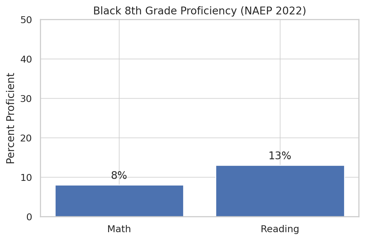 According to the 2022 NAEP scores, only 8 percent of Black 8th graders were proficient in math, and only 13 percent in reading.