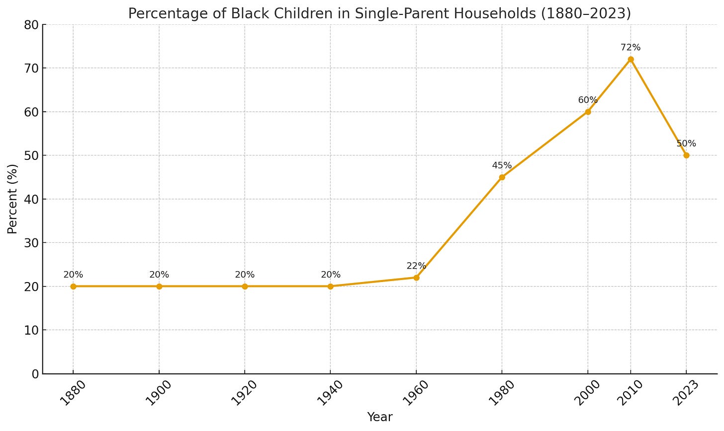 More than 70 percent of Black children in the United States are born to unmarried mothers. As of 2023, about 47 percent of Black mothers are single mothers, and roughly 50 percent of all Black children live in single-parent homes, almost always headed by women.